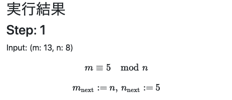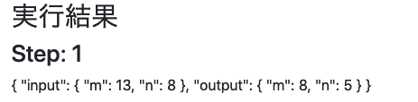 更にフレームワークはアルゴリズムの実行結果を、ステップ毎 に 入力値と出力値と組み合わせ て保存する。そこでアルゴリズム側では、入力値を input フィールド、出力値を output フィールドに入れて、所望のタイミングで yield すればよい。例えば で初期化された場合は、最初に yield される戻り値は、{ input: { m: 21, n: 13 }, output: { m: 13, n: 8 } } となる。
