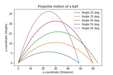 draw_graph()上から順番に f_range() 関数は range() 関数の浮動小数点対応版。calc_trajectory() 関数は与えられた初速と角度に対する弾道を計算する。最後の draw_graph() 関数は、25 度から 75 度まで 10 度毎に弾道を計算してグラフ表示する。