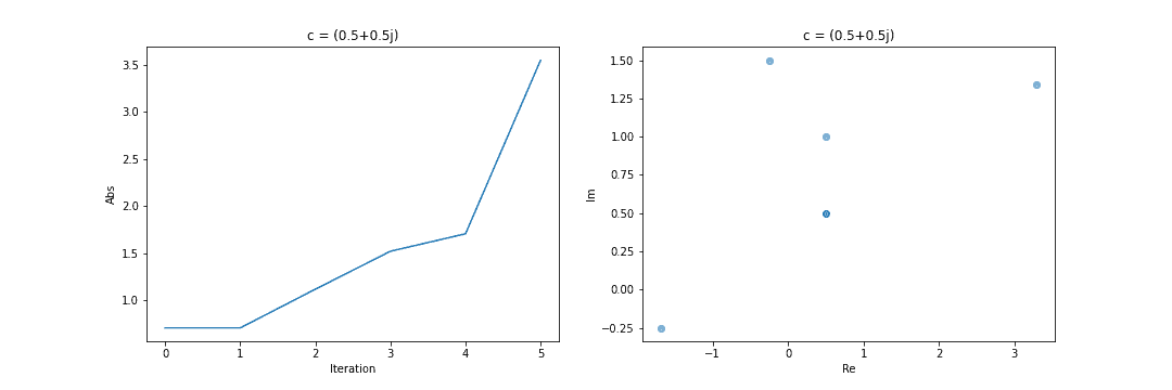 最後に では、ループ回数 5 程度であっさりと絶対値が 2 を超える。