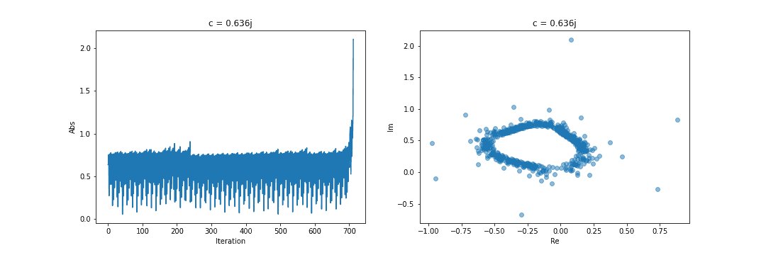 では、輪っかのような図形を描きながら振動した後に、ループ回数 700 を超えたあたりで最終的に発散している。恐らく マンデルブロ集合の縁 にあたる点と考えられる。