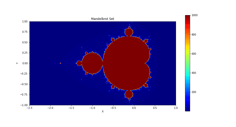 計算機上では簡易的に、1,000 をループ回数の上限として、数列の絶対値 が 2 を超えるループ回数 を計算する。複素平面の任意の点に対して、その ループ回数ごとに色分け することで図形を描く。発散するまでの回数を評価するという意味で、Escape-Time Algorithm とも呼ばれるらしい。