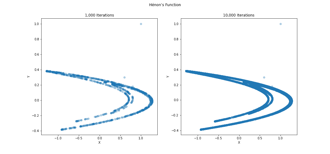 エノン写像 とは、2 変数連立常差分方程式(漸化式)で定義され、2 次元の離散力学系の一種らしい。今回描く エノン・アトラクタ とは、エノン写像に特定のパラメータを与えた時に得られる曲線。