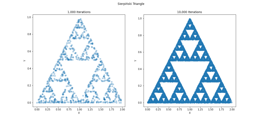 三角形から等分の三角形を無限に抜くことを繰り返して描けるシェルピンスキーの三角形だが、これもバーンズリーのシダと同じように、3 種類のアフィン変換をランダムに繰り返す事でも得られるらしい。