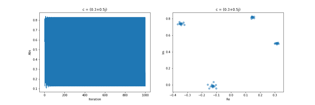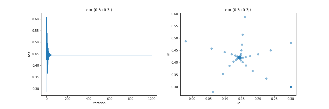 折角なので、幾つかの点に対して発散の様子を観察してみる。まずは発散しない の場合から。左側のグラフは横軸がループ回数、縦軸が数列の絶対値を表す。右側のグラフは散布図を複素平面に見立てて、数列の各項をプロットしたもの。数列はヒトデのような形を描きながら、一点に収束しているように見える。