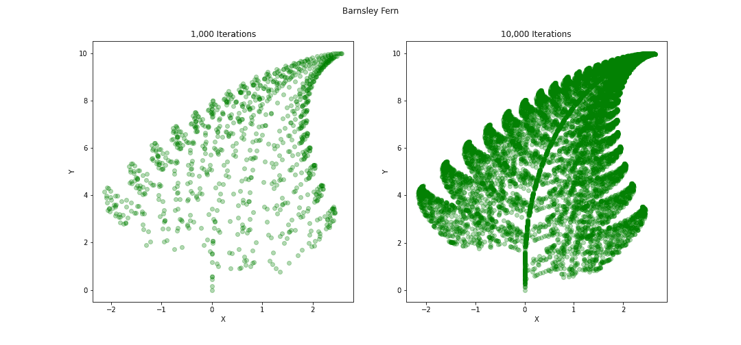 Barnsley Fern(バーンズリーのシダ)は、原点から開始して、特定の発生確率 でランダムに 4 種類のアフィン変換 を繰り返した軌跡として描かれる図形。